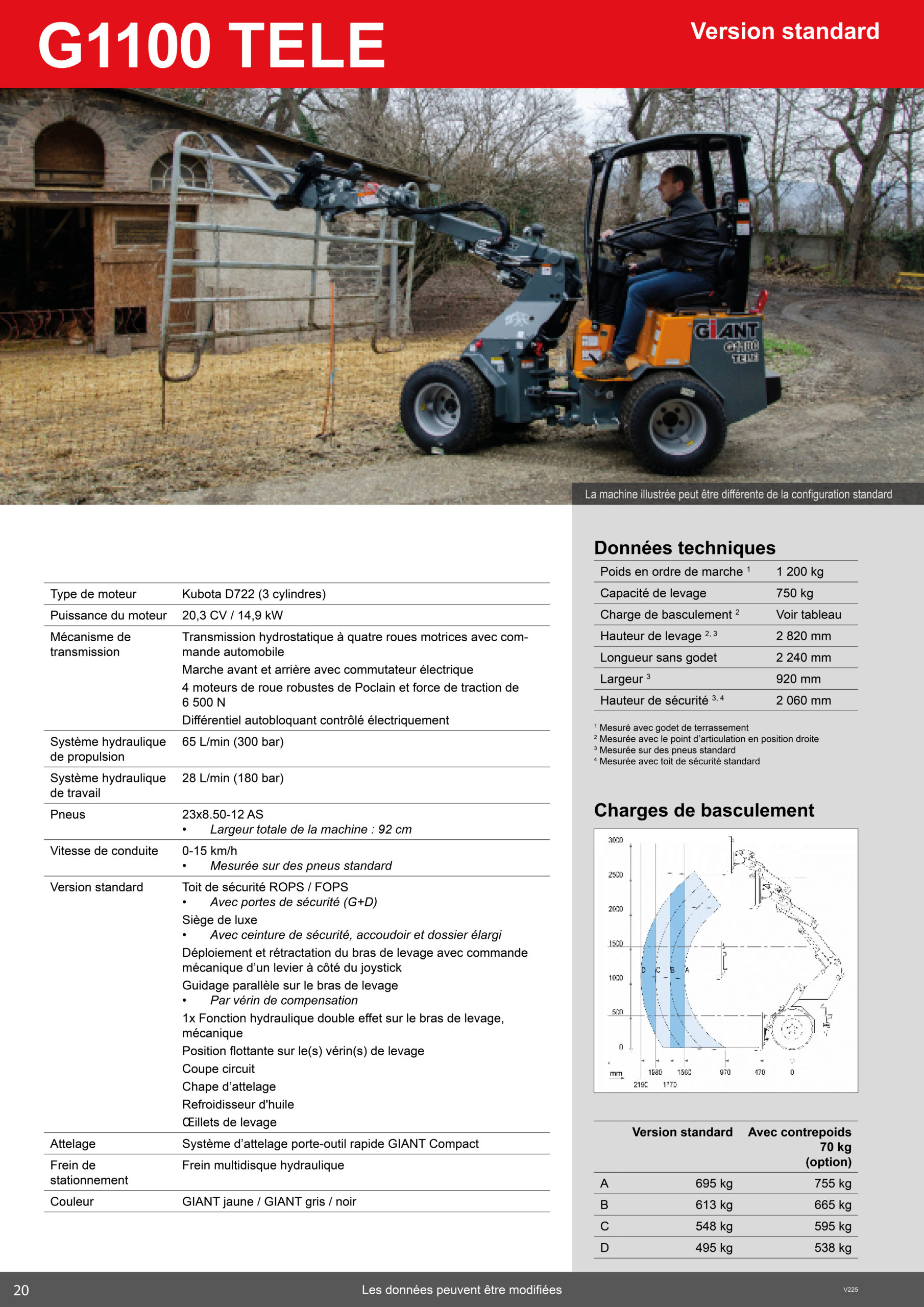 La GIANT G1100 est une chargeuse sur pneus idéale pour intervenir dans des allées étroites. Sa conception compacte et son faible poids en ordre de marche (1 100 kg) lui confèrent une grande maniabilité.