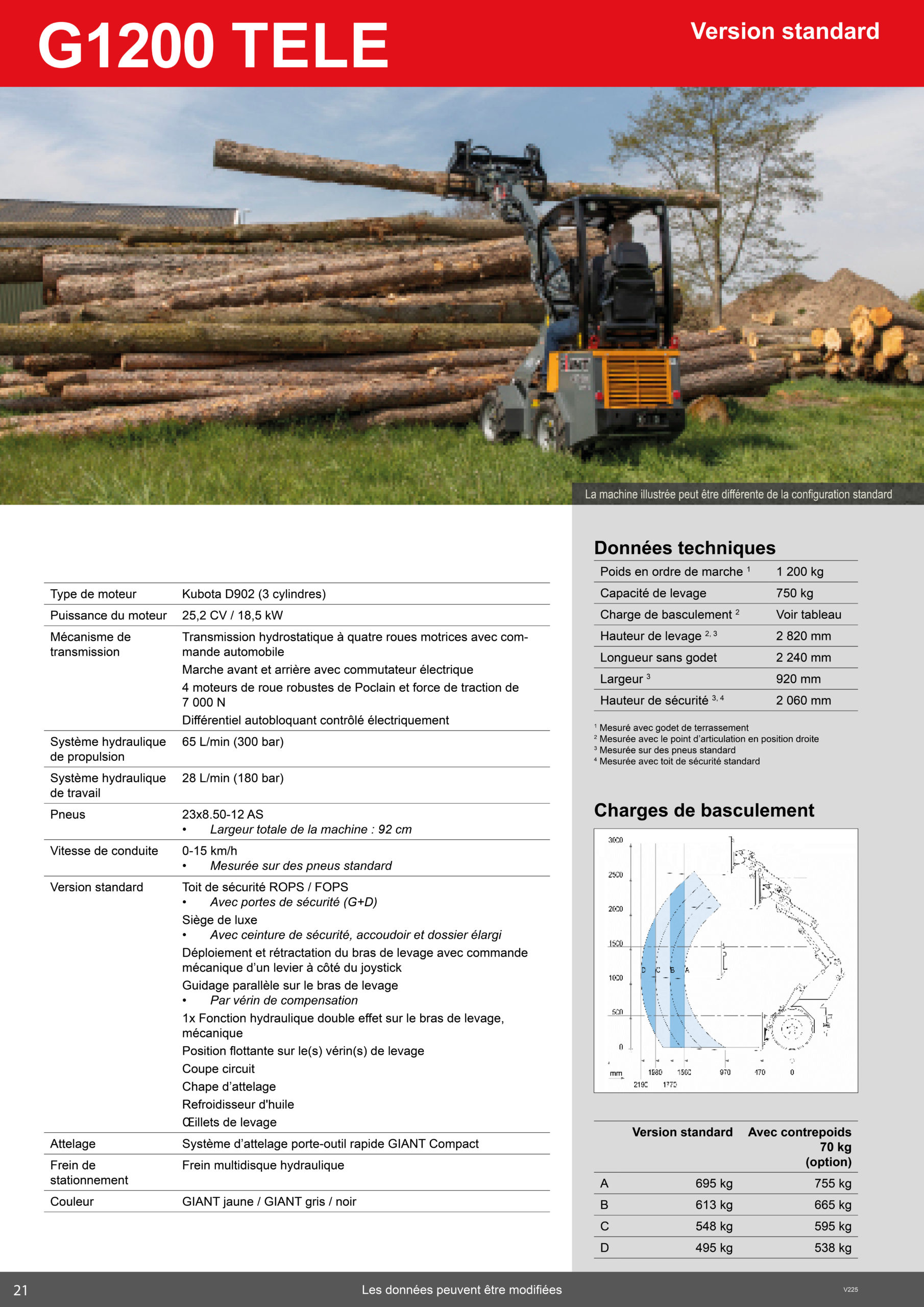 Grâce à son format compact, la machine bénéficie d’un faible rayon de braquage, offrant une excellente maniabilité dans les espaces restreints. Ce qui la rend particulièrement remarquable, c’est son excellent rapport performances/poids. Avec une capacité de levage de 1 100 kg pour un poids opérationnel identique, la G1200 se distingue par son équilibre exceptionnel.