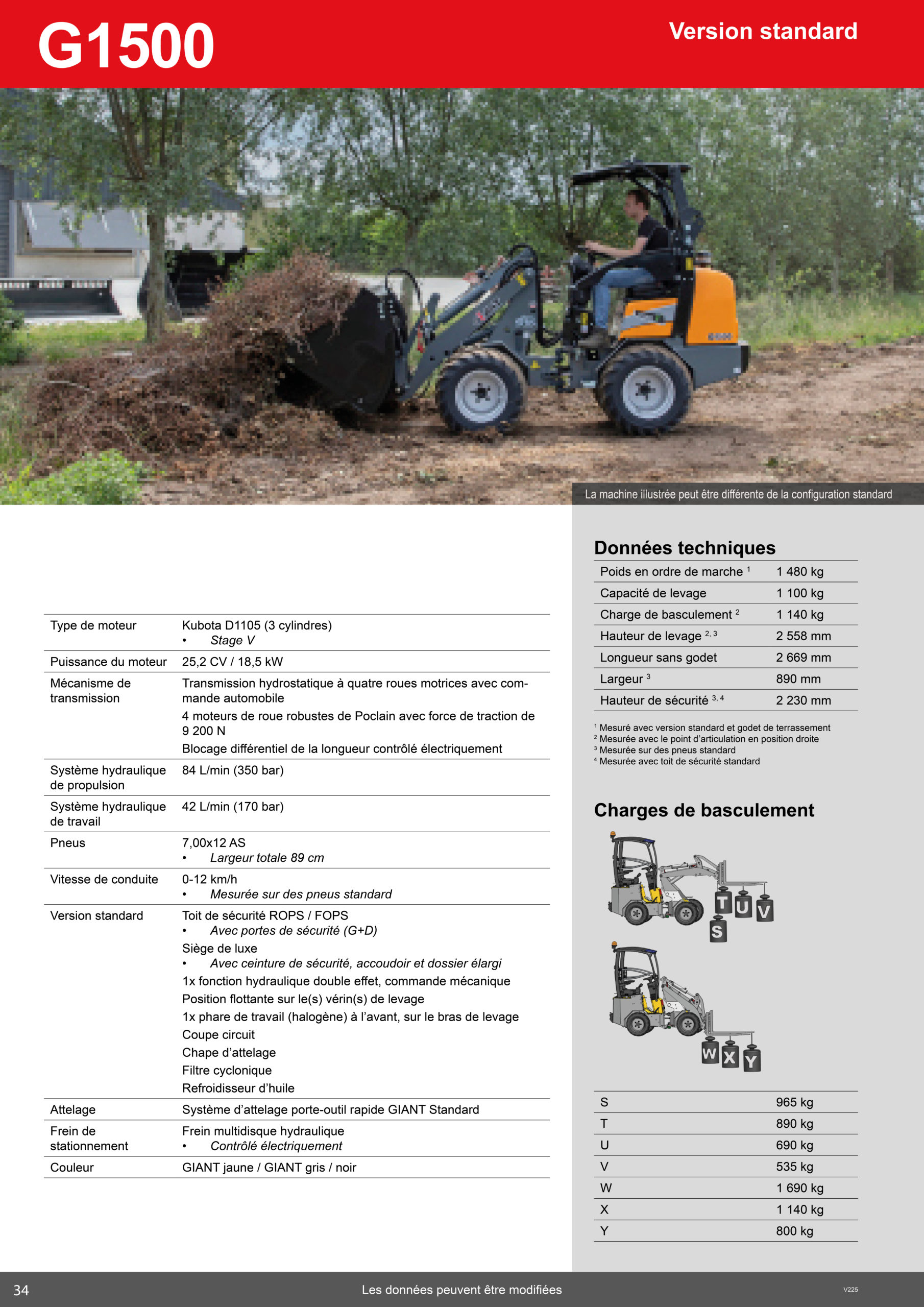 La chargeuse comptacte GIANT G1500 est parfaitement adaptée aux tâches polyvalentes dans les domaines de la construction, du terrassement, des Espaces Verts et de l’agriculture. Avec une hauteur de levage de 2,55 m et une capacité de levage de 1 100 kg, elle facilite grandement les travaux exigeants.