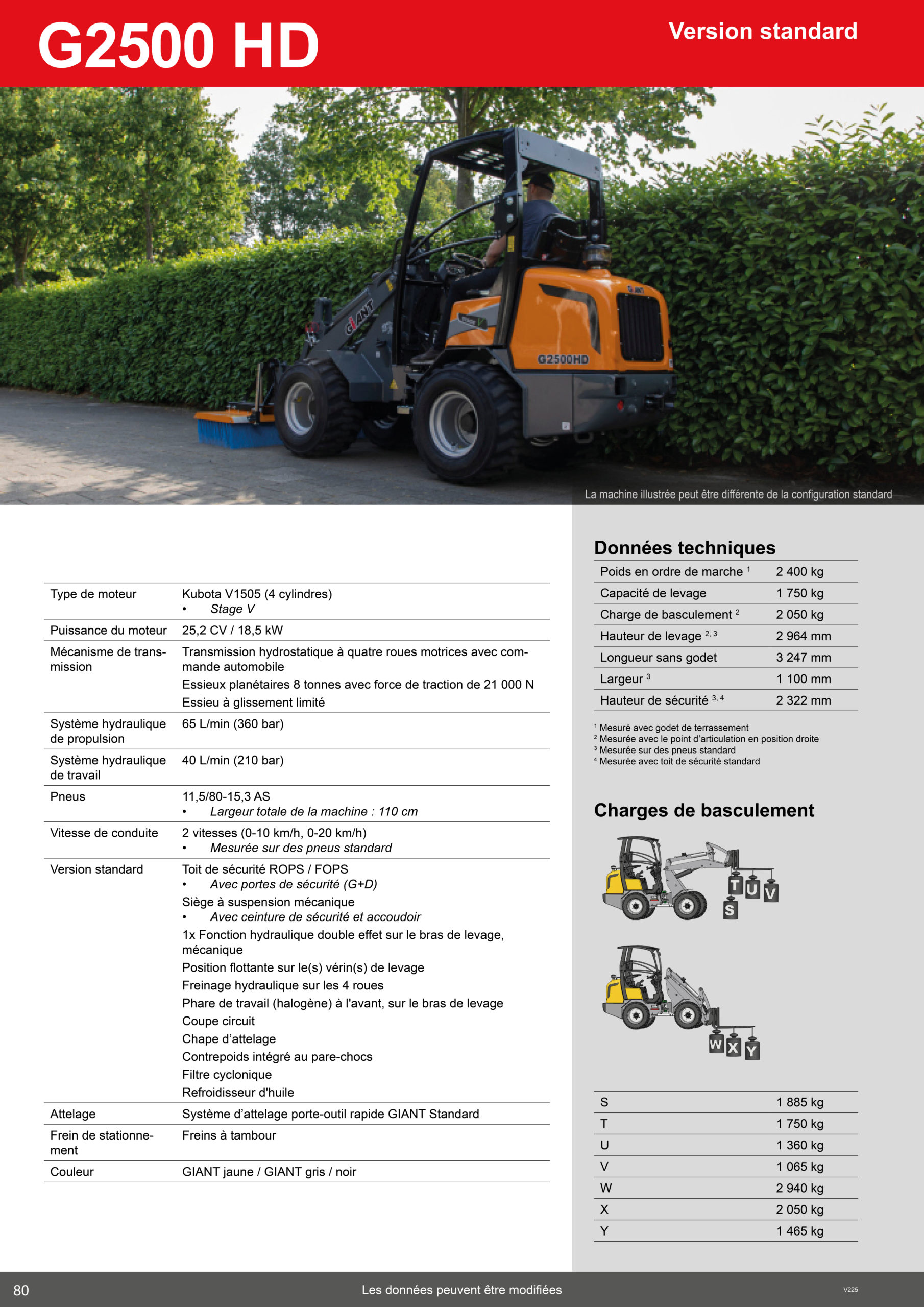 Équipée d’un puissant moteur Stage V de 25,2 CV, la G2500 HD affiche un poids en ordre de marche de 2 400 kg pour une capacité de levage de 1 750 kg.